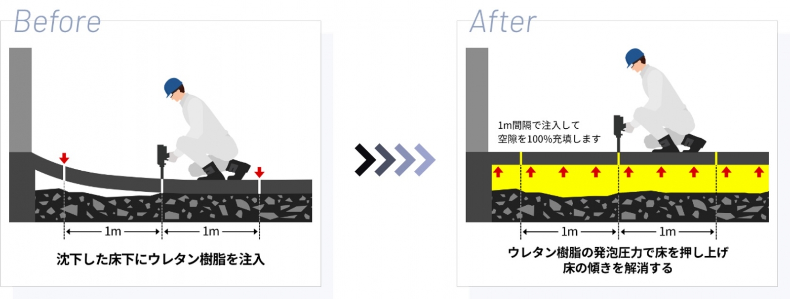 押し上げて修正します。床下に空隙が発生している場合でも、同じ方法で隙間なく空隙充填を行います。